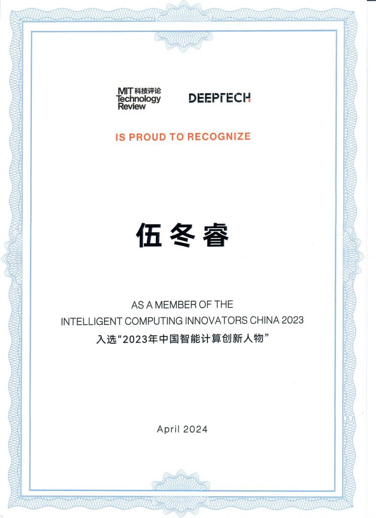 伍冬睿教授入选《麻省理工科技评论》“2023年中国智能计算创新人物”