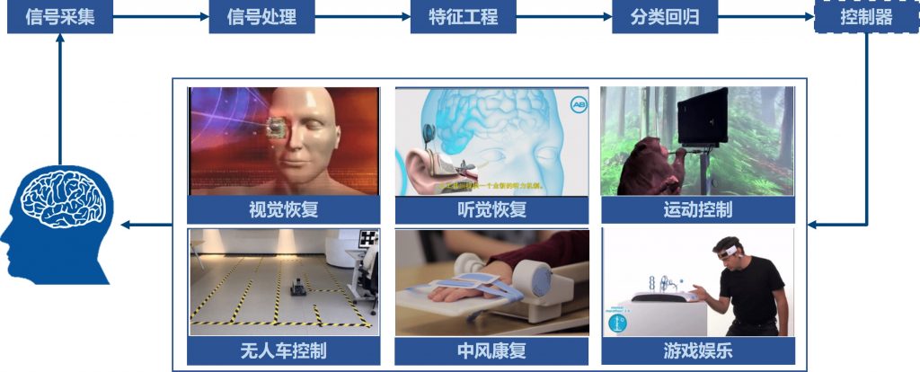 脑机接口主要分为有创和无创两大类。有创脑机接口一般需通过手术植入电极。人脑包含约860亿个神经元,有创脑机接口使用的植入式电极可采集单个神经元的脉冲放电活动,其时间和空间分辨率非常高,可用于视觉恢复、听觉恢复、运动功能恢复、语言解码等。但是,由于电极材料生物兼容性、人体排异反应等原因,植入式电极在大脑中会慢慢失效,需进行更换,增加了其成本和风险。无创脑机接口无需手术,一般通过脑电帽采集头皮脑电(EEG)数据,可用于无人系统控制、中风康复、游戏娱乐等。其优点是受众广、成本低、无风险,但也面临解码困难、对抗攻击、隐私泄露等挑战,这也是华中科技大学脑机接口与机器学习实验室的主要研究内容。