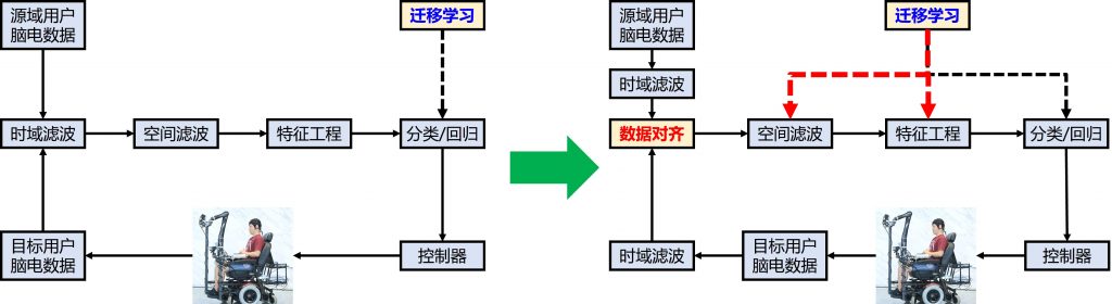在数据对齐的基础上,本实验室进一步提出脑机接口迁移学习完整流程,如图3所示。迁移学习很早就被用于脑电信号解码,其基本思路是借用来自其他用户的数据帮助当前用户进行更快更好的模型训练,但已有工作通常只在分类或回归模型的训练中考虑迁移学习(图3左)。图3右所示的迁移学习完整流程融入数据对齐,并在更多环节,如空间滤波、特征工程等步骤中考虑迁移学习,进一步提升解码效果。大量实验表明,在每个环节中考虑迁移学习均有效果,其中,数据对齐效果最为显著。