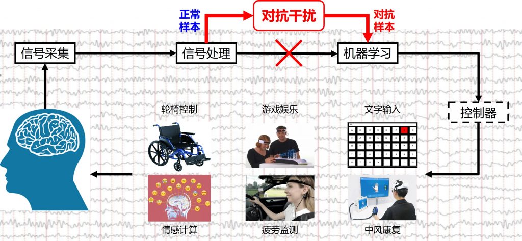 本实验室2019年开始研究脑机接口系统的对抗攻击,为国际最早。目前本实验室对多种不同范式的脑机接口系统均可实现接近100%的攻击成功率,即通过施加微小干扰,几乎可任意篡改脑机接口系统的输出,其效率比随机噪声干扰提升10-300倍。