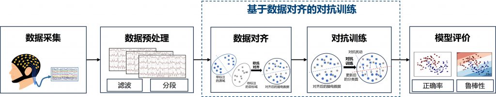 2024年《工业和信息化部等七部门关于推动未来产业创新发展的实施意见》要求“研制一批易用安全的脑机接口产品”。为了兼顾脑机接口解码算法的易用性(精准解码)与安全性(对抗安全),本实验室提出了基于数据对齐的对抗训练策略, 融合迁移学习与对抗训练来同时提高解码准确度和对抗安全性,如图5所示。具体地,先使用数据对齐以利用来自其他用户的数据提升脑机接口对当前用户正常样本的分类正确率,再结合数据对齐和对抗训练进一步提升脑机接口模型在当前用户样本上的解码准确度和对抗鲁棒性。实验结果显示,本算法可提高正常样本的分类正确率12.5%、对抗样本的分类正确率29倍。