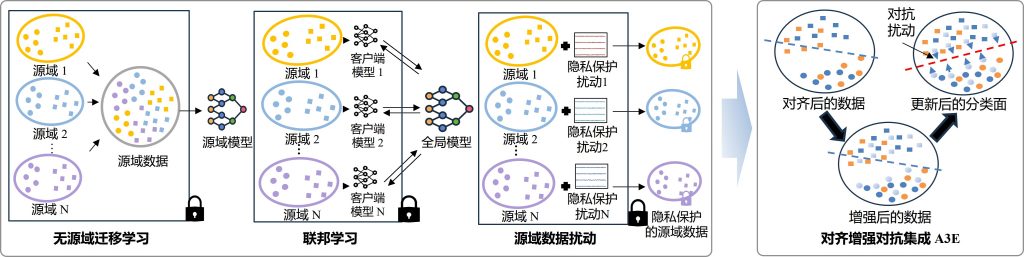 针对上述问题,本实验室提出了对齐增强对抗集成算法(图6),在隐私保护的前提下,同时实现精准解码和对抗安全。具体地,我们考虑了无源域迁移学习、联邦学习和源域数据扰动三种不同的隐私保护场景: