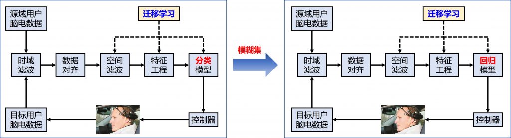既然脑机接口分类问题已有很多效果很好的算法,是否可以通过简单的步骤把这些分类算法直接推广到回归问题?本实验室从2017年开始进行相关研究,提出了基于模糊集构建模糊类、把分类算法高效拓展到回归问题的思路(图9),在脑机接口回归问题的信号处理和迁移学习中都取得了良好效果。目前本实验室正在把前述精准、安全、隐私保护的脑机接口分类问题解码算法,以及知识数据融合的分类问题解码算法,通过模糊集相关方法拓展至回归问题。